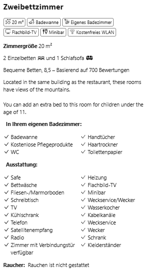 Mit einer Fläche von 20 m² bietet das Twin-Zimmer einen warmen und gut gestalteten Raum, ideal für einen Aufenthalt zu zweit, mit Freunden oder mit der Familie. Es verfügt über zwei komfortable Einzelbetten, die für ihre Qualität anerkannt sind und von über 700 Reisenden eine hervorragende Bewertung von 8,5 erhalten haben. Ein Schlafsofa ergänzt die Ausstattung und bietet eine praktische Lösung für zusätzliche Schlafgelegenheiten, insbesondere für Kinder.